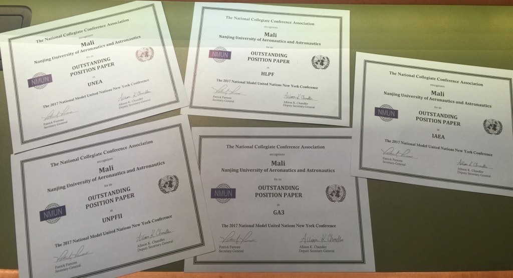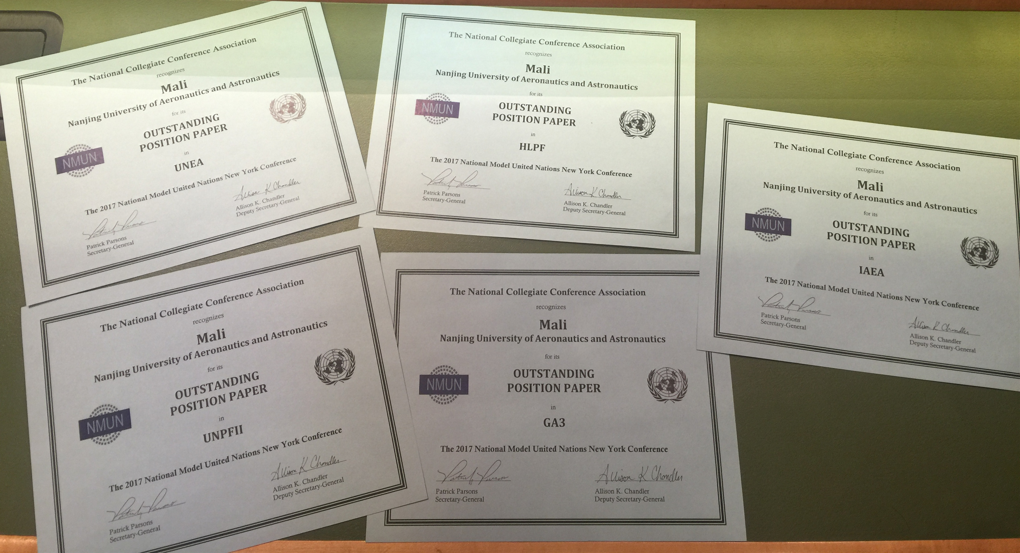 2017纽约全美模拟联合国大会(2017NMUN)于3月19日至25日在纽约如期举行,腐漫画 代表团凭借出色的参会表现再次荣获大会“优秀代表团”(Distinguished Delegation)团体二等奖,并获得5项“最佳立场文件”(Outstanding Position Paper)个人奖,在去年首次参会获奖的基础上再次突破,也成为此次参会中获奖最多的国内高校。