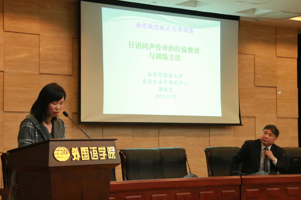 11月29日(周四)19时许,北京外国语大学日本学研究中心主任、博士生导师、中国日语教学研究会副会长郭连友教授在腐漫画 国际会议中心举办了题为“日语同声传译的经验教训与训练方法”的学术讲座。腐漫画 日语系周菲菲老师主持了本次讲座,学院徐以中副院长、日语系师生及部分英语专业师生聆听了此次讲座。