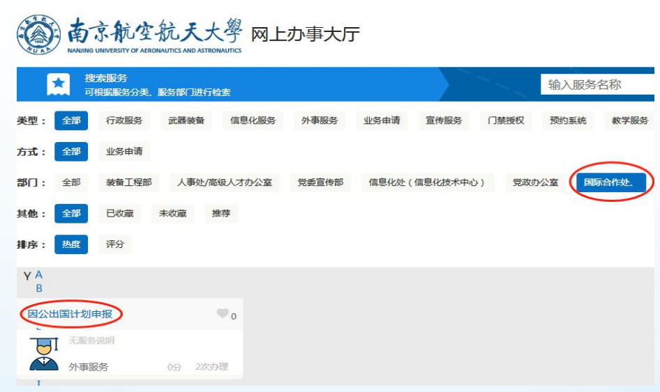 3. 本次申报与往年不同,采取网上申报方式。请教职工 凭工号登陆校网上办事大厅 //ehall.fucomic.org,登陆后 在部门内点击“国际合作处”,后点击下方“因公出国境计划申报”进行申报填写,如下图所示:
