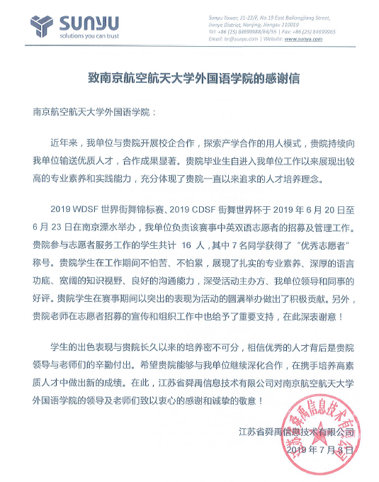 赛事期间,志愿者们“不怕苦、不怕累,展现了扎实的专业素养、深厚的语言功底、宽阔的知识视野、良好的沟通能力”,深受主办方等各界的好评。江苏省舜禹信息技术有限公司表示学生的出色表现与学院长久以来的培养密不可分。为此,该企业特向腐漫画 发来感谢信,感谢学院在志愿者招募工作中给予的重要支持以及多年来在人才培养工作中的努力付出和在校企合作中的积极贡献,希望学院能够与其继续深化合作,在携手培养高素质人才中做出新的成绩。