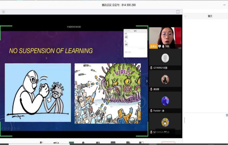 潜移默化 思政育人。疫情是灾难,也是学习的动力和契机。正式开课之后,老师们各显其能,各尽其责,结合疫情发展和课程特点,恰当融入思政教育课程发挥外语课程全面育人功能。有老师紧跟国内外疫情的变化,利用丰富的网络资源,积极拓展第二课堂,既增加了学生的英语知识,又在潜移默化中增强了学生的民族自豪感与责任感。更有教师在学术英语口语部分增添了与应对疫情和建立人类命运共同体相关的TED视频资料,并以小组协作的方式组织研究生从学术英语谋篇布局的角度分析研究目标、研究方法和研究意义,同时鼓励并指导学生对抗疫短片“We Are All Fighters”进行配音演讲,很好地将口语能力提升、英语写作能力锻炼和疫情现实关怀一起融于在线课堂。