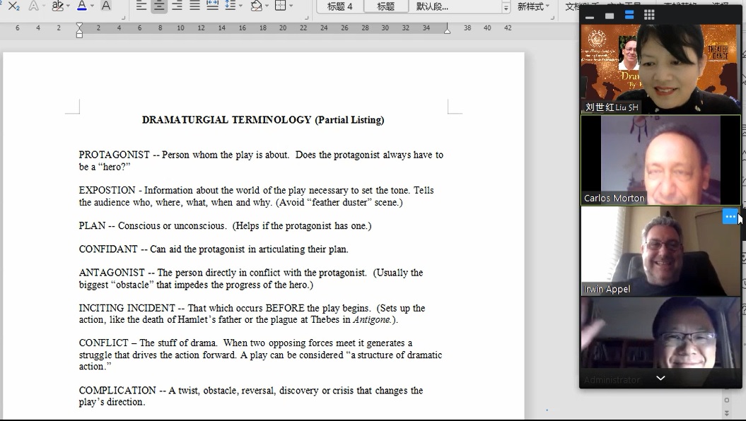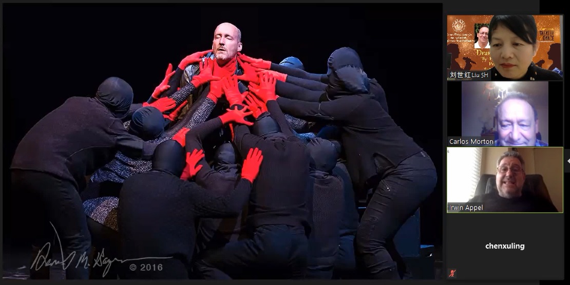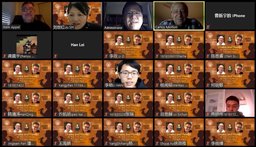 在线讲座由腐漫画 副教授刘世红策划和主持,腐漫画 院长范祥涛教授致欢迎辞。讲座分为两场,第一场由Carlos Morton教授主讲,他结合莎士比亚最有影响力的戏剧作品《哈姆雷特》介绍了亚里士多德的戏剧理念、戏剧的起源、戏剧的各要素,如主角、反面角色、情节、事件、矛盾冲突、高潮等,深入浅出,娓娓道来;第二场由Irwin Appel教授主讲,他从导演的角度探讨了戏剧《哈姆雷特》的主题和多种舞台表现手法,并展示了他自己创办的剧团表演、自己导演的戏剧《哈姆雷特》的精彩剧照和片段。身为演员的Appel教授还亲自朗诵了几段戏剧主角哈姆雷特的经典台词,情感充沛,震撼人心。两位还对戏剧这种文学体裁、戏剧作品《哈姆雷特》进行了深度挖掘和多维度的拓展,听众们深受启迪,得到了美好的艺术熏陶。在讲座提问环节,学生表现出色,他们围绕戏剧哈姆雷特的现实意义、现代戏剧的意义、死亡哲学等内容,通过语音、或者聊天室打字踊跃发言、频频发问。两位教授们对学生们高质量有深度的提问非常赞赏,并耐心地进行解答和交流,气氛十分活跃。讲座长达两个多小时,但大家仍觉得意犹未尽。在英文歌曲《友谊地久天长》)的美妙旋律中,讲座落下帷幕,画上了圆满句号。