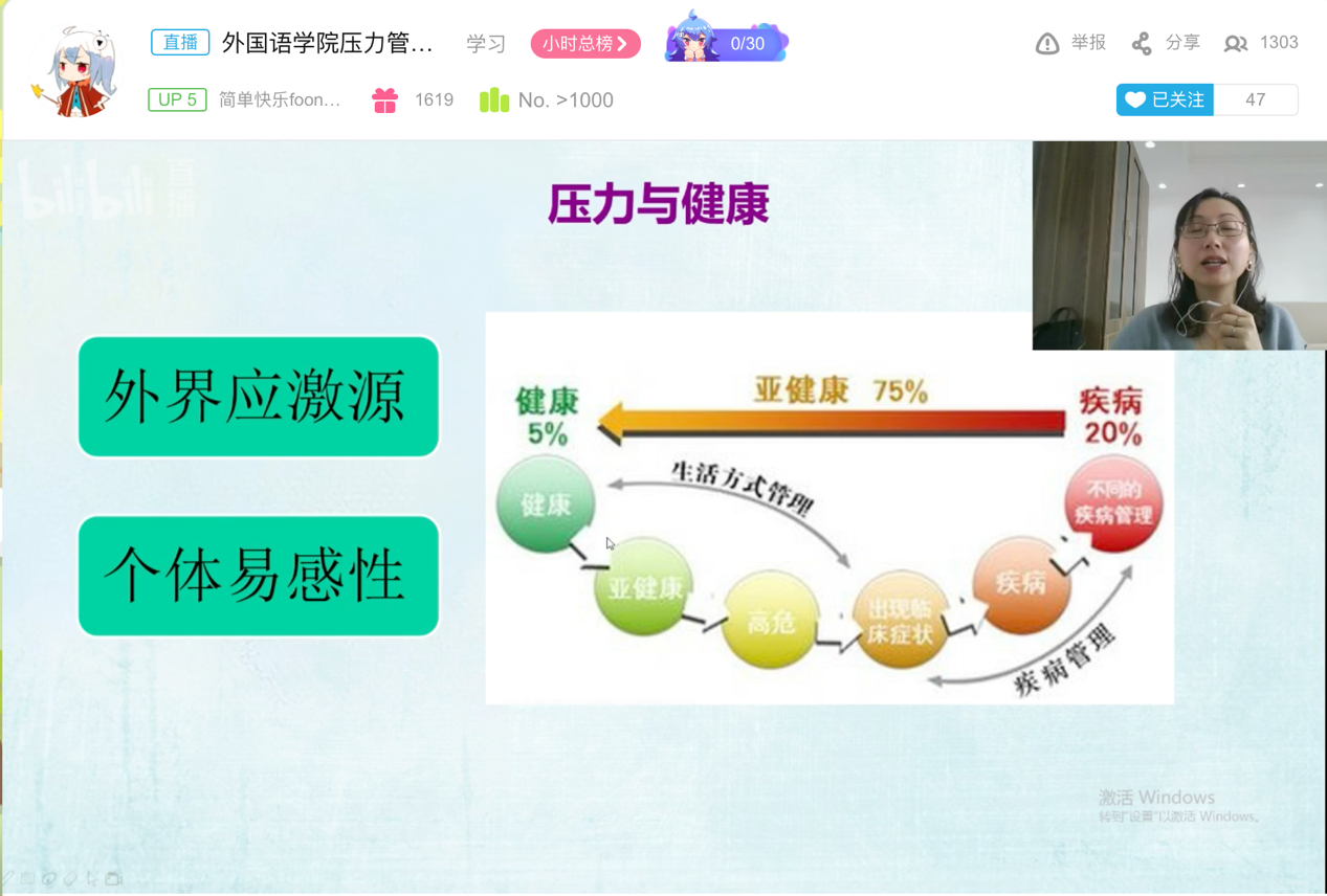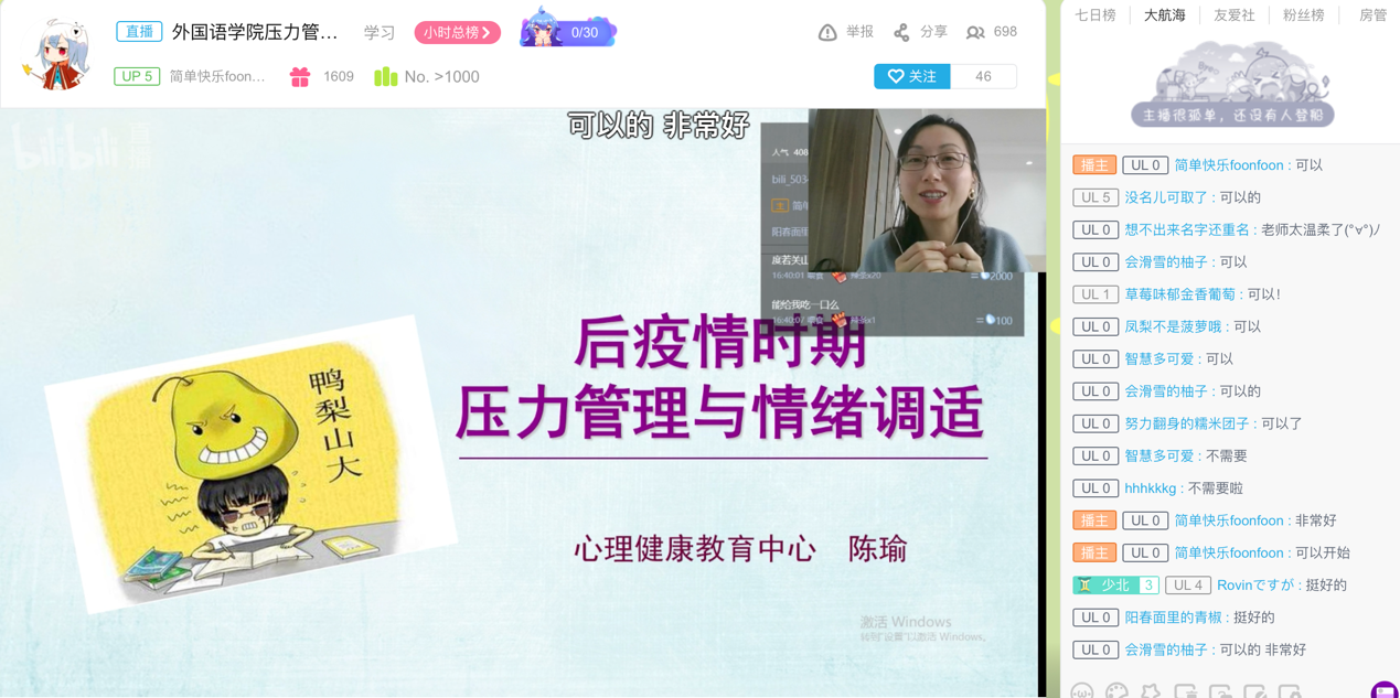讲座开始前,陈瑜老师指导大家填写了疫情下的压力测试问卷,并通过一张趣味图片引出了“压力”这一主题词,从心理学的角度解释了压力的概念,即“压力就是应激”。随后她结合自己线上对疫区居民进行心理援助和对腐漫画 学生开展心理健康疏导的经历,就同学们如何管理压力提出有效建议——优化认知因素、调整应对方式、完善支持系统以及建立多点支撑生活方式。最后介绍了情绪的调适方法,教会同学们理解焦虑及抑郁情绪背后的意义,以及如何应对这些情绪。