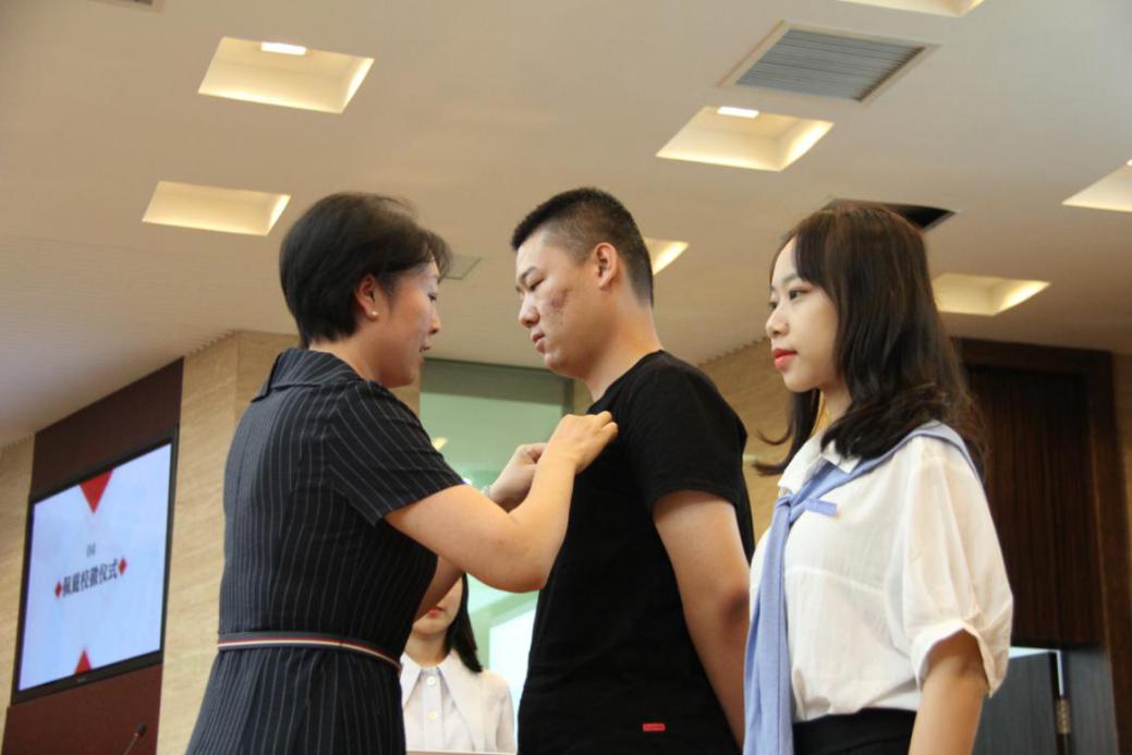 典礼最后,院党委书记左彤云为新生代表们佩戴了校徽。小小的校徽意味着沉甸甸的责任与希望,它象征着从今天开始,新生将以“南航外院人”的身份,与外院“家人”一起携手并进,乘风破浪。