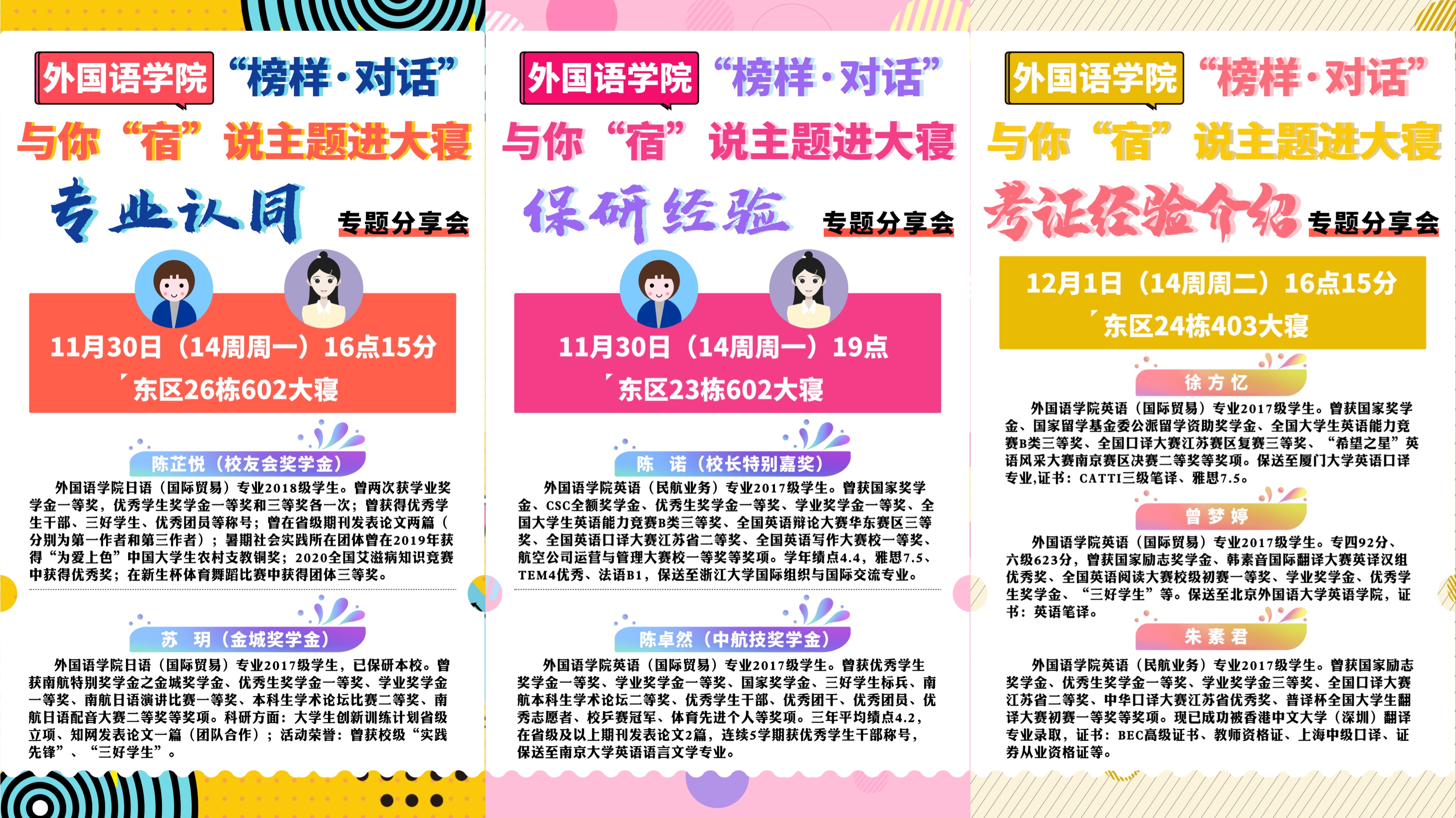为有效解答低年级专业学习和未来选择的困惑,腐漫画 近期开展了3期“榜样·对话” 之与你“宿”说主题进大寝专业学习专题系列分享会。辅导员与高年级优秀学长学姐走进不同宿舍,分别从专业认同、保研经验、考证经验这三个方向与低年级学生们展开深入交流。