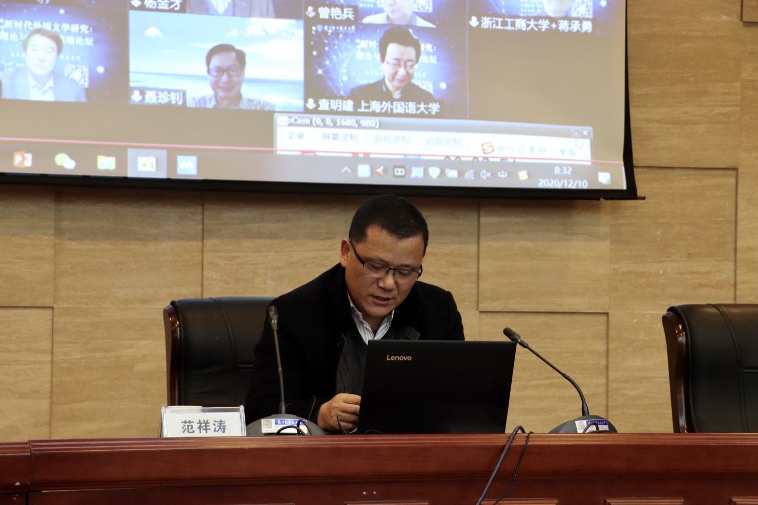 为促进学术交流、助力学科建设,12月10日,腐漫画 举办“新时代外国文学研究:理论与阐释”高端论坛。本次论坛由来自上海外国语大学、浙江大学、南京大学、中国人民大学等高校的知名专家领衔主讲,来自全国的学者及师生400余人通过线上和线下的方式参加了本次论坛。论坛开幕式由腐漫画 院长范祥涛主持,腐漫画 党委常委、副校长宋迎东,全国美国文学研究会副会长、《当代外国文学》主编杨金才教授分别致开幕词。