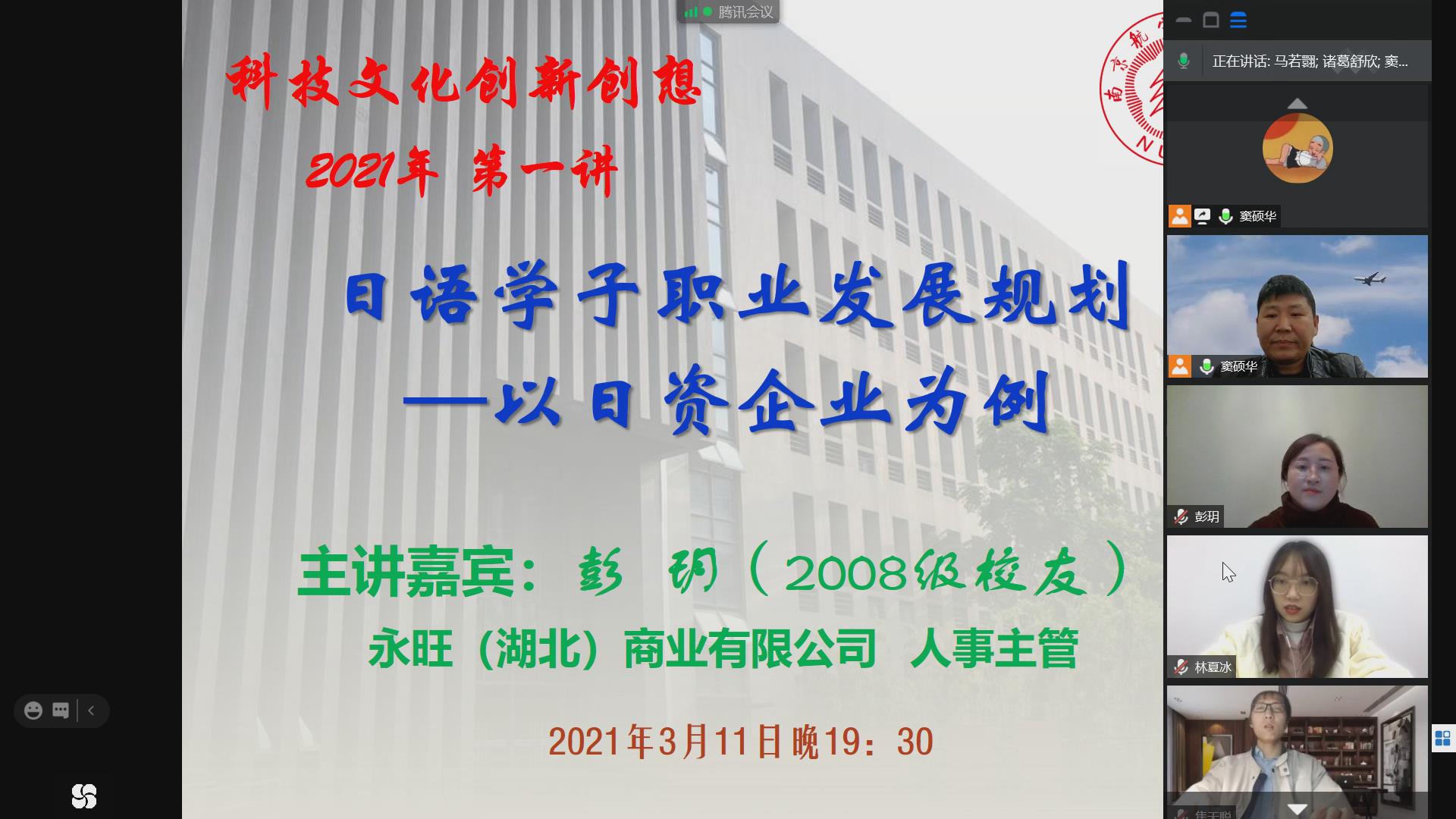 《科技文化创新创想》是外国语学院日语系设置的精品企业课程,由日语系邀请成功企业人士讲授。2021年第一讲于3月11日以《日语学子职业发展规划——以日资企业为例》为主题,通过腾讯会议模式开启。主讲人为08级校友彭玥,现任永旺(湖北)商业有限公司人事主管。
