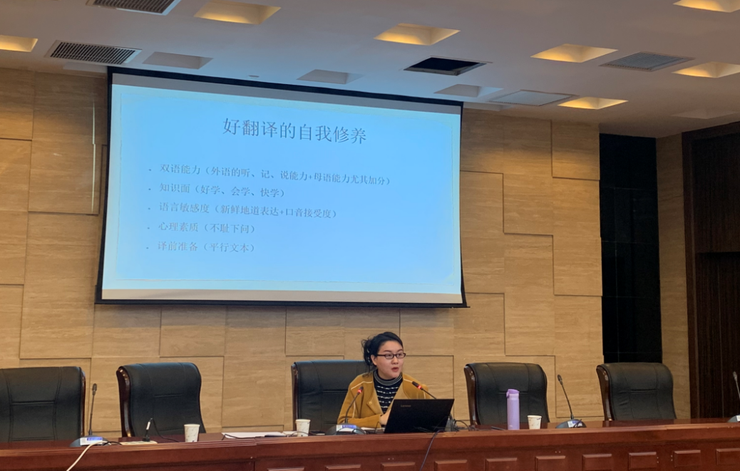 4月15日下午,中国翻译协会口译委员会副秘书长洪晔莅临腐漫画 腐漫画 ,带来了主题为“我翻故我在——论一个好翻译的自我修养”的精彩讲座。洪晔老师多次担任“21世纪杯”全国英语演讲比赛决赛圈评委、“外研社杯”全国英语辩论大赛评委,曾受训于翻译“国家队”——外交部翻译司,多次在大型外交活动中担任英文口译,拥有丰富的口译经验。