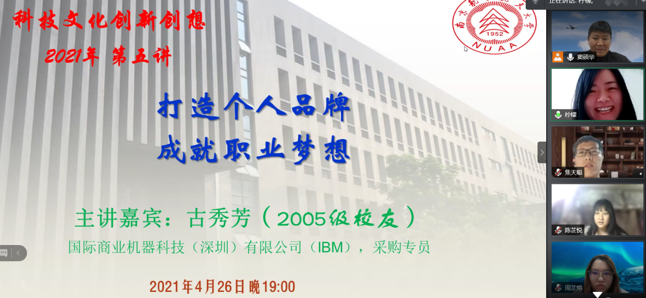 4月26日晚上7:00,外国语学院日语系科技文化创新创想课程第五讲通过腾讯会议模式开启,主题为《打造个人品牌,成就职业梦想》,主讲人为05级日语系校友古秀芳,现任国际商业机器科技(深圳)有限公司(IBM)采购专员。