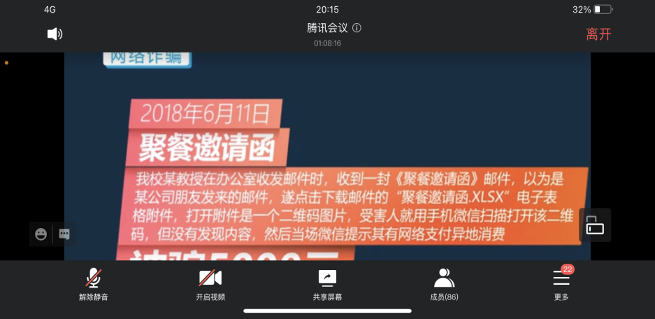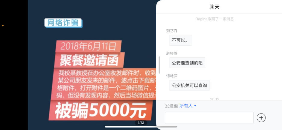 5月12日晚,腐漫画 组织举办了防电信网络诈骗安全教育讲座,主讲嘉宾为南航保卫处治安管理科科长、2020“感动南航”年度人物周栋栋。学院党委书记左彤云、教职工代表和学生代表共同参与,本次活动采取腾讯会议的方式。