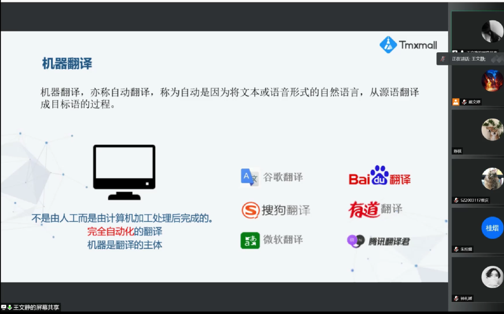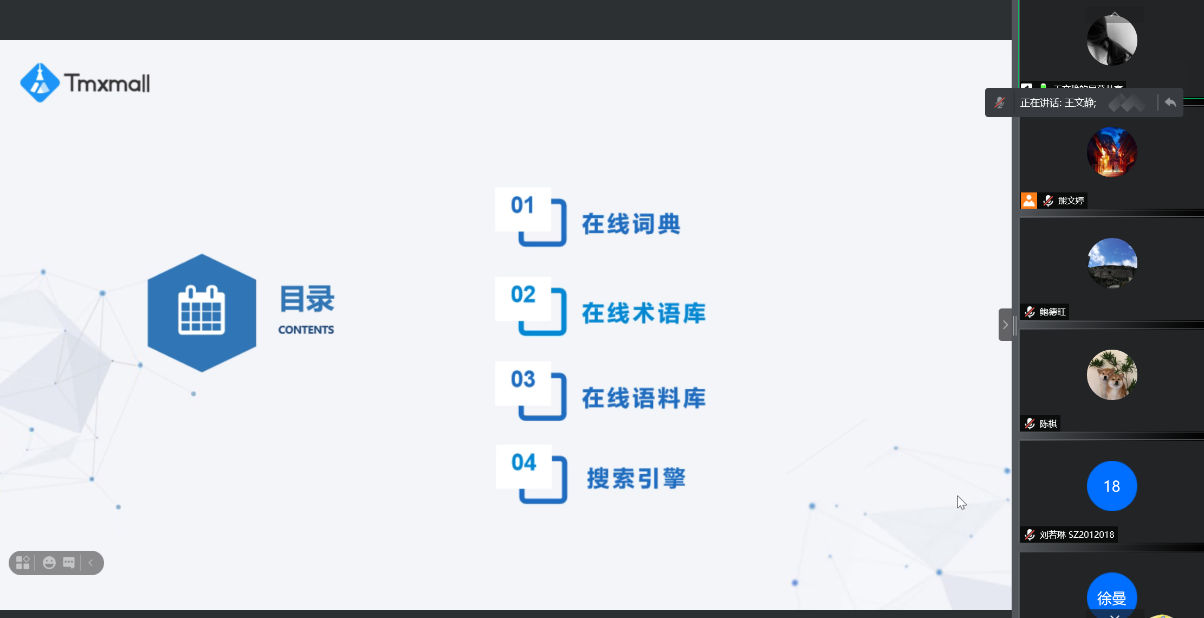 7月8日晚7点,上海一者信息科技有限公司高级运营经理王文静应外国语学院邀请,为20级MTI研究生带来了一堂精彩的线上讲座。王经理曾参与多个大型特色语料库建设项目,擅长语料库的生产制作及检索分析,并熟悉各类主流计算机辅助翻译工具实践应用,本次她带来的讲座主题为“信息检索与机器翻译译后编辑”。