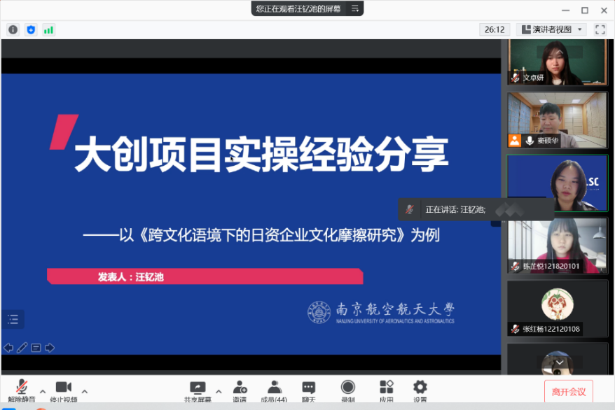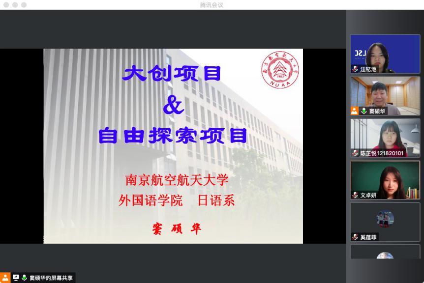 10月19日下午,外国语学院日语系主任窦硕华副教授与汪钇池、陈芷悦和文卓妍同学组成宣讲团向全院学生介绍了大学生创新训练计划项目及自由探索项目。宣讲会通过腾讯会议模式开启,英语系、日语系同学及部分本科生导师参加了会议。