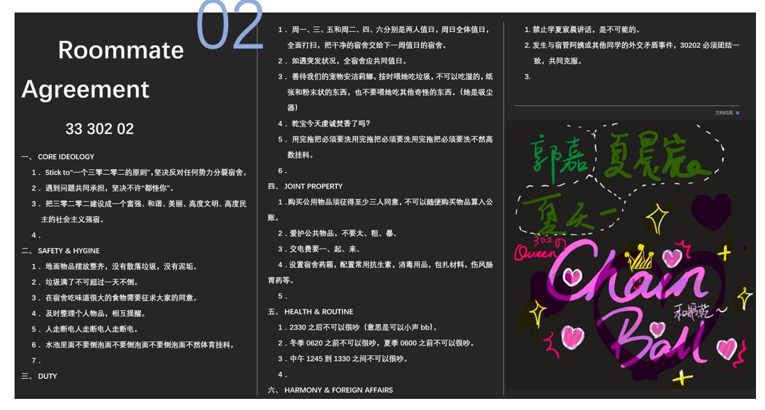 宿舍公约制定活动活动期间,同一寝室的新生们,一同协商,,一同规划,为营造宿舍美好和谐的氛围出谋划策,为构建美丽蓝图共同奋斗。合理的公约是文明小寝的第一步,文明小寝的创建需要同学们遵守公约,团结友爱,互帮互助。