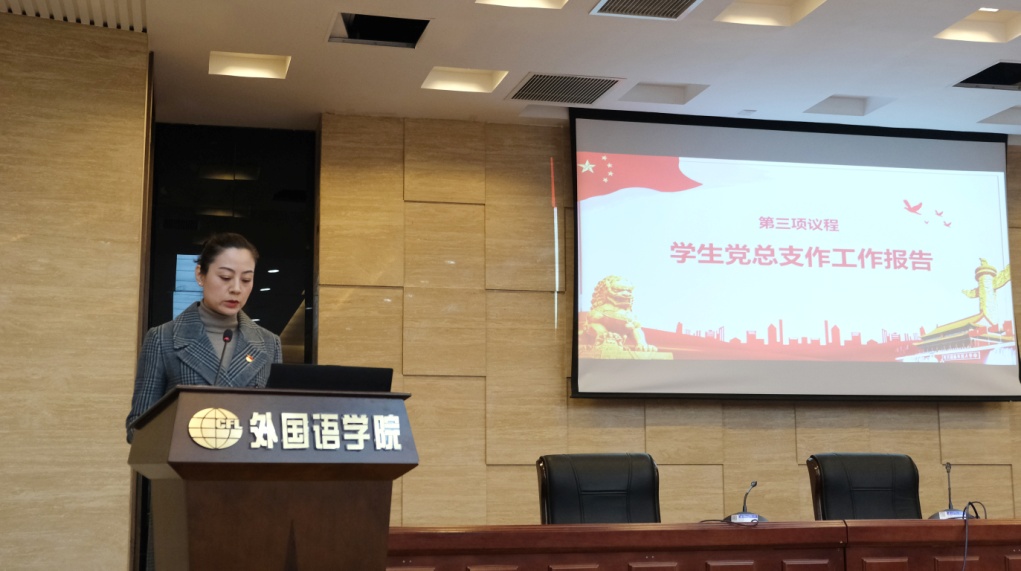 学生党总支书记梁薇代表学院本届学生党总支作了“以史为鉴强信念跟党走,开创未来求创新担使命”的工作报告,申明本次大会的任务是全面回顾总结学生党总支四年来的工作,组织凝聚各学生党支部进一步发挥战斗堡垒作用,动员全体学生党员进一步发挥先锋模范作用,同时选举产生新一届外国语学院学生党总支委员。