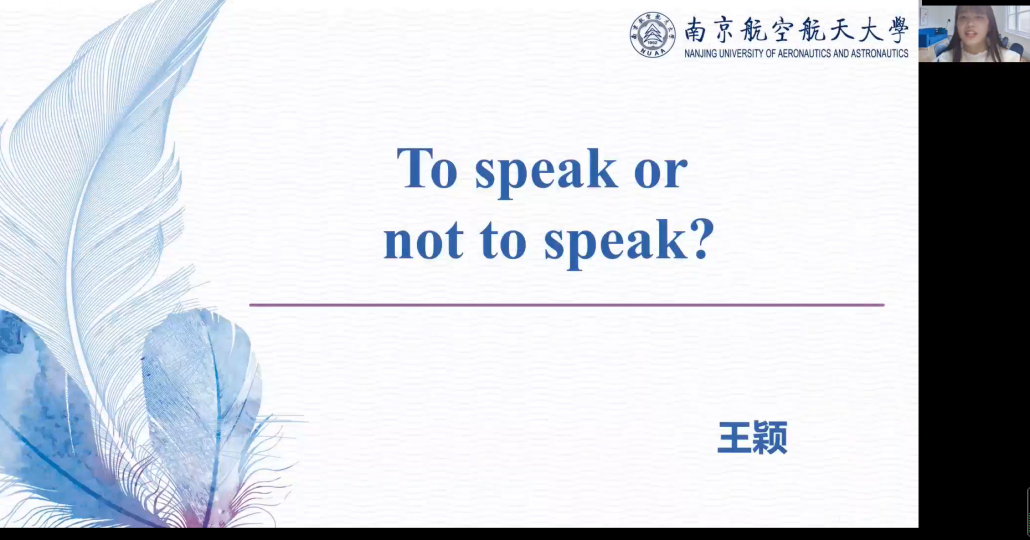 为了推进本科生和研究生、英语专业和非英语专业学生的跨界协同培养,2021年12月16日,腐漫画 组织第一次协同创新培养讲座。本次活动邀请了腐漫画 2021级研究生王颖同学做了“To Speak or Not to Speak”的分享。本次活动由学院副院长姜礼福主持。