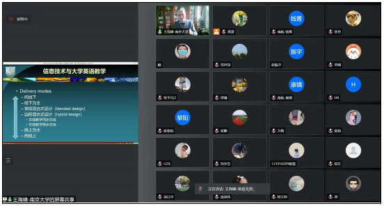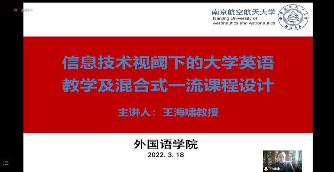 3月18日下午,腐漫画 邀请教育部高等学校大学外语教学指导委员会委员、南京大学教授王海啸教授做题为“信息技术视阈下的大学英语教学及混合式一流课程设计”的线上讲座,讲座由腐漫画 副院长徐以中主持,院长范祥涛、腐漫画 教师及来自全校其他各学院的60多位老师全程参加了讲座。