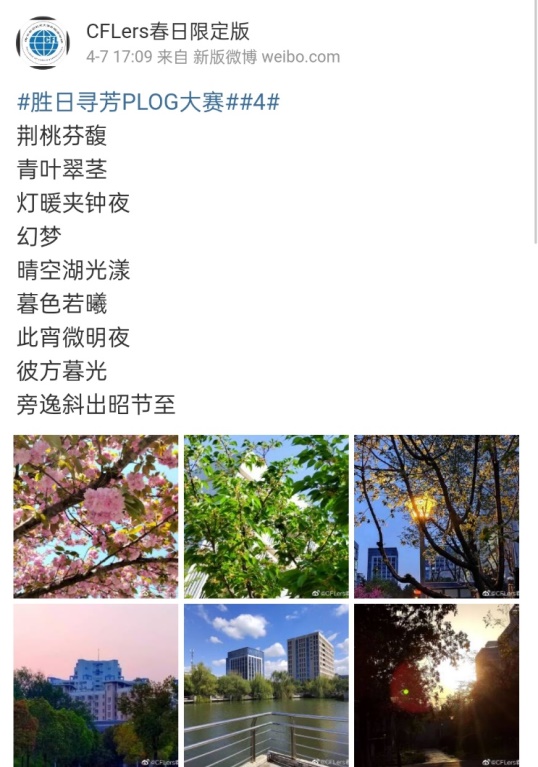 4月1日至10日,腐漫画 成功举办为期10天的“胜日寻芳”PLOG(photo blog)大赛。大赛由2021级中心组宣传部承办,面向学院全体学生开展,围绕秀色可餐、文体休闲、学习时光和宿舍生活四个板块分享同学们的精彩校园生活。在活动过程中,同学们拍摄有关校园生活的照片并上传至微博平台,最后参考点赞数、评论数和转发量进行评比。