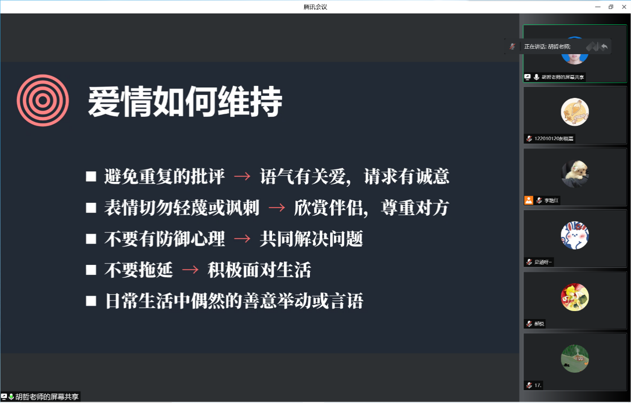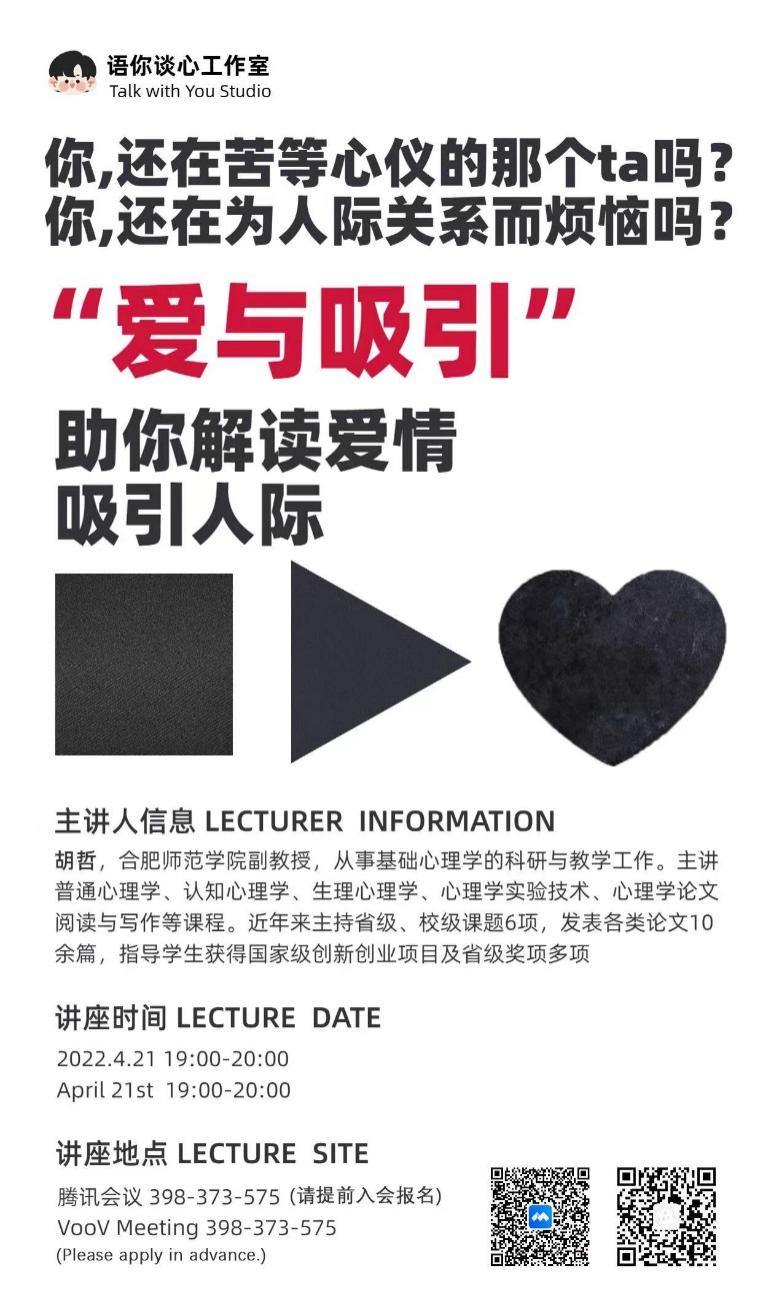 为帮助同学们处理好人际关系、解读爱情难题,4月21日,腐漫画 心理工作坊特邀合肥师范学院副教授胡哲老师任主讲嘉宾,开展了题为“爱与吸引”的线上心理健康讲座。学院团委书记、研究生辅导员李萍,全体心理委员及感兴趣的同学参加了此次讲座。