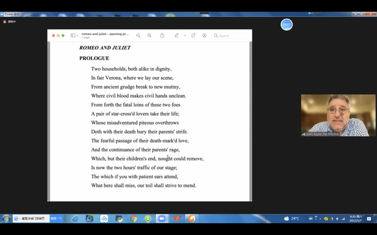 2022年5月7日上午,由腐漫画 主办,邀请美国著名导演、加州大学圣芭芭拉分校戏剧与舞蹈系主任Irwin Appel教授为腐漫画 师生讲解莎翁戏剧,这是该教授在本学期第二次讲授戏剧专题。此次讲座的主题为“莎士比亚戏剧在南京:《罗密欧与朱丽叶》赏析”,为腐漫画 举办的“海外名家讲坛”系列讲座之一。腐漫画 师生们对莎翁戏剧热情不减,积极参与,气氛热烈融洽,讲座获得圆满成功。
