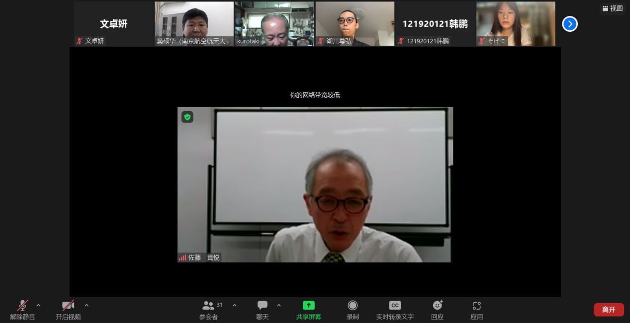 5月28日(周六)上午9:00,外国语学院日语系海外名师讲坛第一讲通过线上ZOOM会议成功进行,主题为《現代東アジア社会の文化的基礎としての伝統儒学》。主讲嘉宾为环太平洋大学教授・筑波大学名誉教授佐藤贡悦。讲座由日语系主任窦硕华老师主持,外专项目领衔人・东京农业大学黒瀧秀久教授和南航日语系40余名同学参加了讲座。