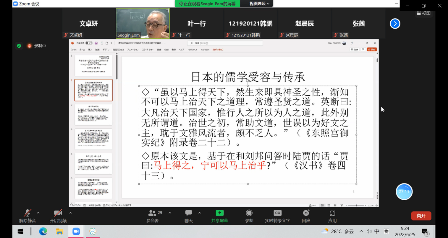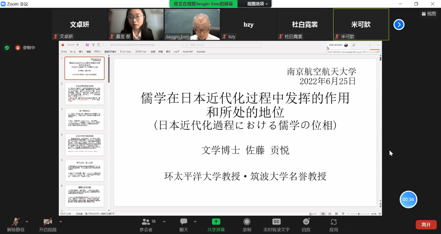 6月28日(周六)上午9:00,外国语学院日语系海外名师讲坛第二讲通过线上ZOOM会议成功进行,主题为《儒学在日本近代化过程中的作用》。主讲嘉宾为环太平洋大学教授・筑波大学名誉教授佐藤贡悦。