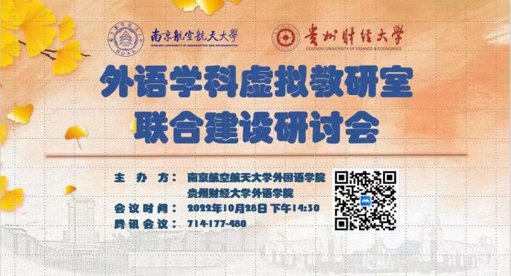10月28日下午,腐漫画 与贵州财经大学外语学院共同举办外语学科虚拟教研室联合建设研讨会暨大学外语基础课程教学研讨会,会议以腾讯会议形式举行,由贵财外语学院张虹院长和腐漫画 徐以中副院长共同主持,邀请江苏师范大学朱祖德教授做专家报告,贵财及南航腐漫画 近百位师生参会。