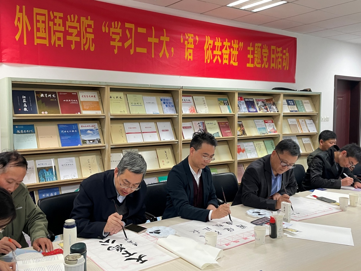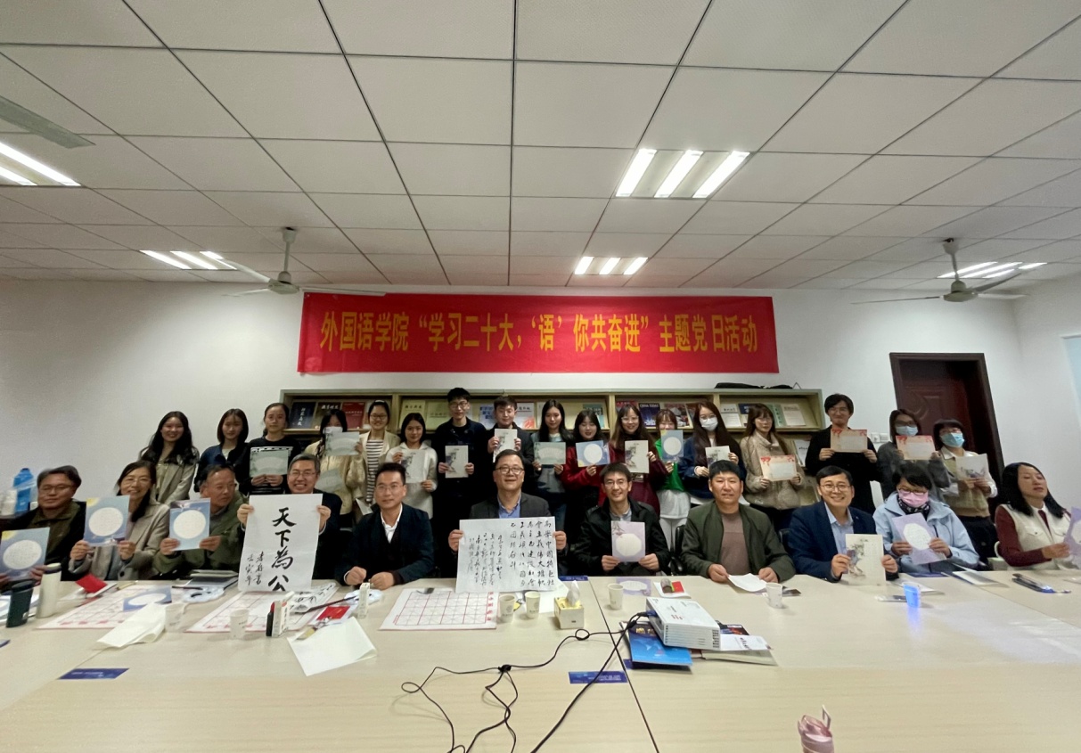 活动最后,全体党员以软笔、硬笔书法的形式抄录党的二十大报告金句,献礼伟大祖国。大家有的用钢笔在印有祖国山河的画卷上书写对祖国的美好祝福;有的则提起毛笔,用饱含深情的书法祝福祖国的伟大事业和光明前景。腐漫画 院长范祥涛还为活动题写了寄语,希望师生们努力奋进,建设更加强大繁荣的祖国。