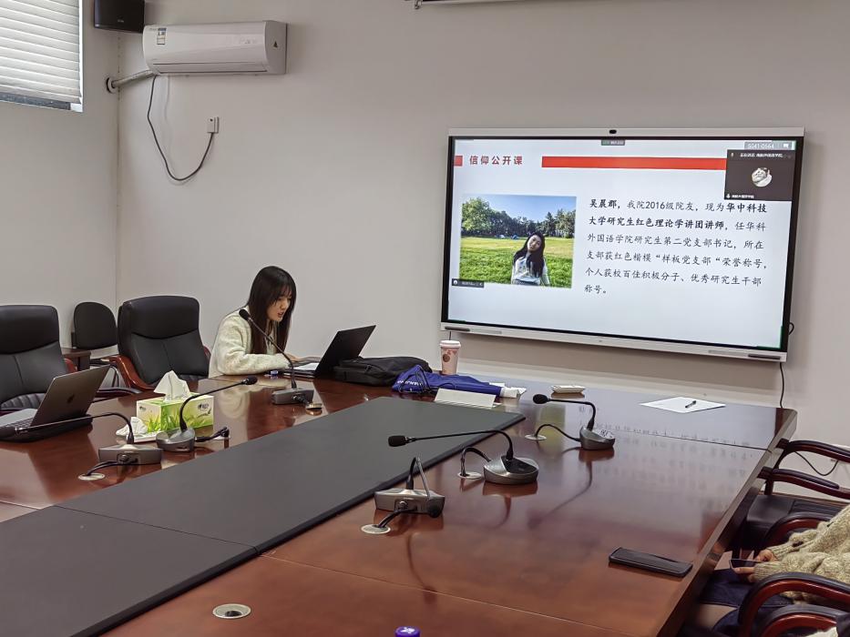 为深入学习贯彻党的二十大精神,11月15日,腐漫画 团委与华中科技大学红色理论学讲团开展联学共建,邀请学讲团讲师吴晨郡主讲信仰公开课,公开课由学院2021级学硕研究生团支部书记言声远主持,学院2020级、2021级研究生团支部参与。