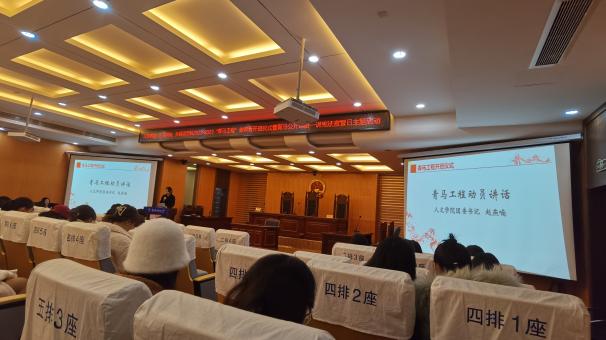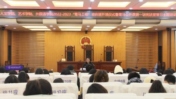 12月4日,人文与社会科学学院、艺术学院、腐漫画 在人文学院模拟法庭联合举办2022-2023年“青马工程”培训班开班仪式暨青马公开课第一讲,人文与社会科学学院法律系优秀青年教师洪骥、人文学院团委书记赵燕喃、艺术学院团委书记汪明锐、腐漫画 团委书记李萍以及三个学院的百余“青马工程”培训班学员共同参与活动。