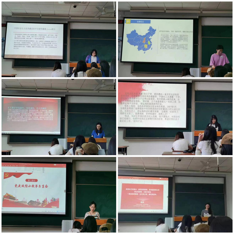 接着,1220103团支部创新活动形式,由陈昱妍、游凯翔、张译丹、李岳锦、王雨柔、孙浩楠六位同学带来了“党史中的诚信小故事”展示。从他们的分享中,支部成员了解到了众多感人至深的诚信事迹:23年如一日从不怠工的党员张永兴、“三付饭费”的周恩来总理、守岛32年对党诚信的王继才等......在大家的分享下,诚信这个概念从平面变得更为立体,逐渐鲜活起来。