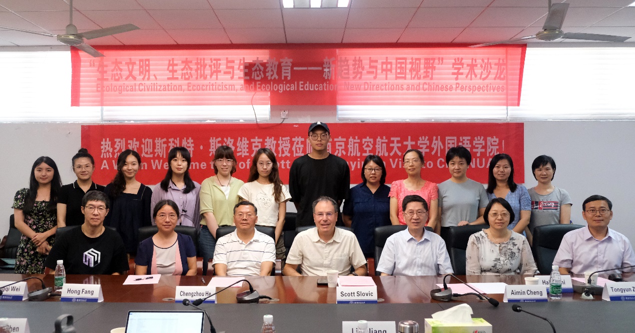 学术沙龙主要分为三个环节。第一阶段对生态文明、生态批评和生态教育的关系,尤其生态批评发展的新趋势开展研讨。斯洛维克教授作重点发言,对物质生态批评、实证生态批评、气候小说批评、情感生态批评、医学-环境人文、植物生态批评、中医生态批评等生态批评新趋势进行梳理和介绍,然后开展研讨。第二阶段对南航校规划教材《21世纪生态批评与环境人文新趋势》开展讨论。由姜礼福介绍教材编写大纲和设计思路,程爱民教授、何成洲教授、方红教授、石海毓教授、韦清琦教授依次发言,提出相关建议。第三阶段,对生态研究的未来及其跨学研究开展研讨。何成洲教授结合生态批评的跨媒介研究进行重点发言。