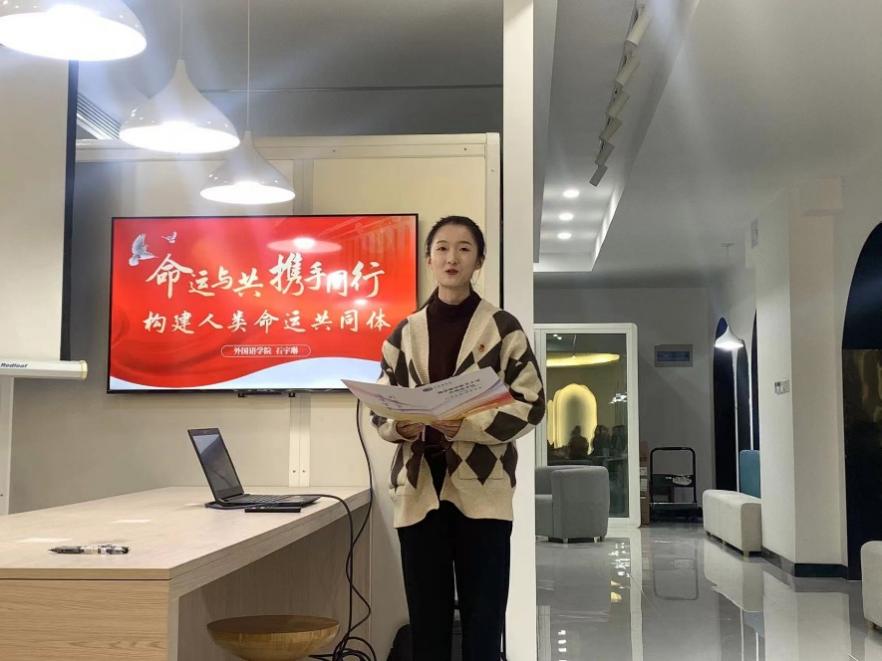 大二团支书石宇琳首先以《命运与共,携手同行——共建人类命运共同体》为题的团课分享。她以一段“卫星眼中人类命运共同体”的小视频引入主题,深入阐述了全球人类命运紧密相连、休戚与共的共同体观念。她从人类命运共同体的四个内涵——国际权利观、共同利益观、可持续发展观和全球治理观的角度分别举例,深入浅出的讲解,使参会同学对人类命运共同体有了更深刻的理解。随后,石宇琳同学联系腐漫画 的“Mr.China”实践团队以及模拟联合国项目,提出了自己对外语青年在了解参与国际事务、推动人类命运共同体中应当发挥积极作用的观点。