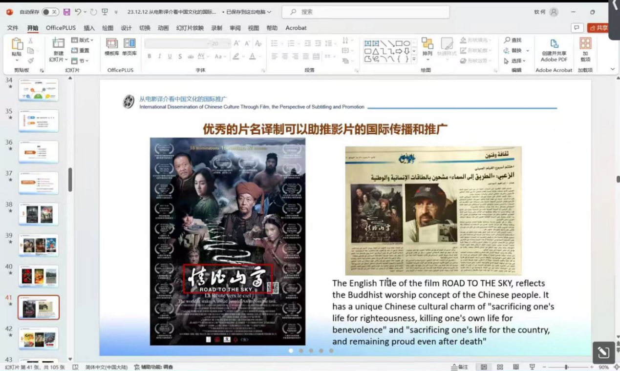 随后,何钦结合了自己参与的多部国际电影节入围作品,如《情比山高》等,用实际案例为同学们详细梳理了从翻译在影片开发、创作、宣传和发行中每个环节的应用,深入分析中国电影对外译介中所面临的挑战。他认为,一部优秀的作品,要想成功申报国际电影节,除了电影本身优秀外,更需要了解各大电影节的规则和特点,并充分做好宣传物料的准备和译制工作。