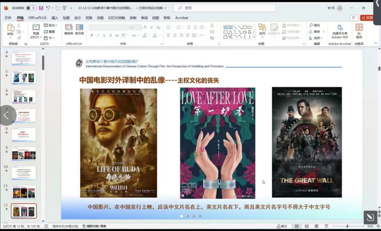 对于这些问题,何钦表示我国需要制订对外译制的国家标准,完善译制流程。要想实现一部好的译制,需要译者、电影主创、后期制作及宣发人员在译制和推介过程中的分工与协调,并需要译制监制来统筹把关整个译制全流程。此外,何钦还为同学们详细讲解了译制过程中中外片名字体和色彩的处理,从片名、片头、片尾及对白字幕介绍了当前译制中的错译现象,提出中国电影在对外译制过程中的解决方案等。