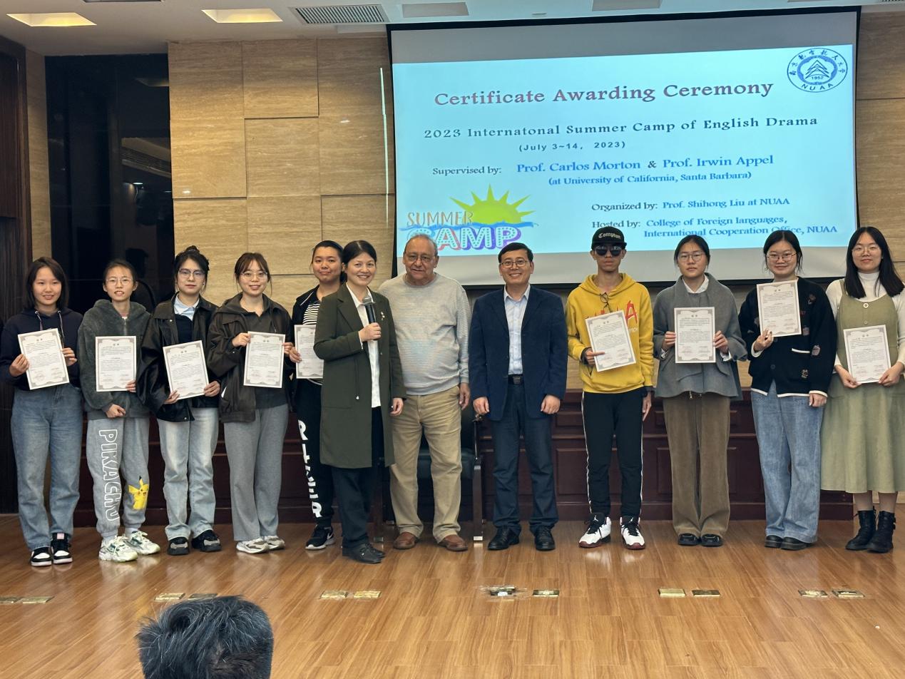 表演正式开始之前,进行了学校暑期国际课程“2023年度英语戏剧国际夏令营结营证书”发放仪式,该国际夏令营课程为腐漫画 策划的特色国际课程、也是院团委组织的大学生暑期社会实践活动,目前已经连续举办四期,由加州大学的两位教授卡洛斯·莫顿和欧文·爱普(Irwin Appel)联袂执教,成为暑期课程中的热门课程。腐漫画 副院长姜礼福教授和卡洛斯·莫顿教授亲自为学生们颁发了结营证书。