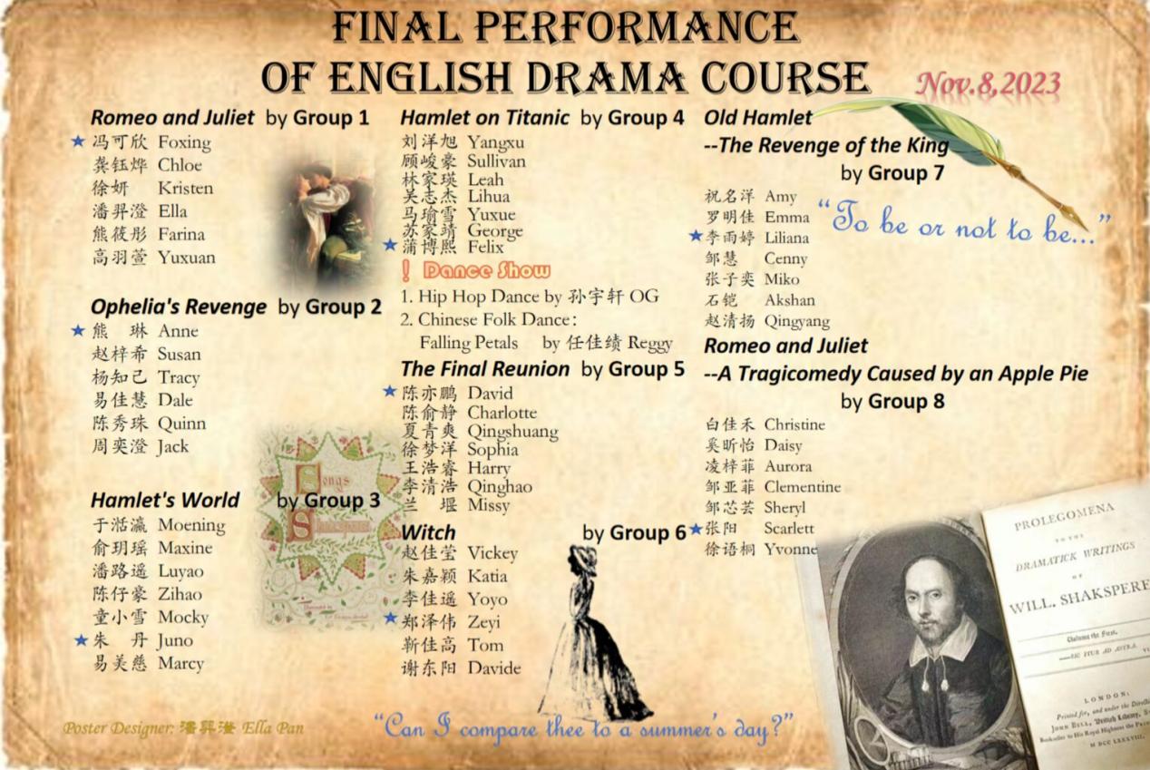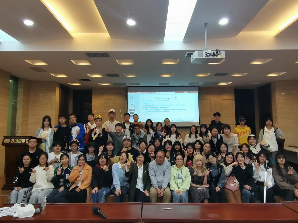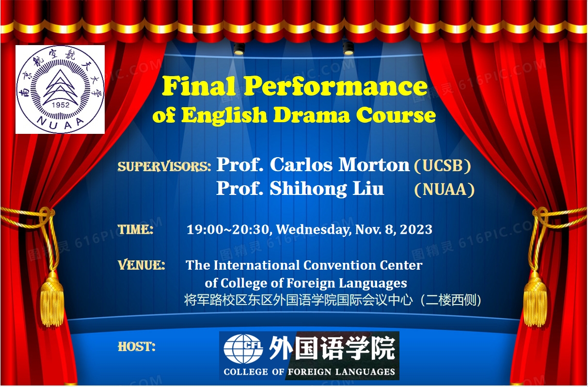 2023年11月8日晚,腐漫画 在国际会议中心成功举办了校通识课《英语戏剧》课程汇报演出。该课程由美国著名戏剧家、加州大学卡洛斯·莫顿(Carlos Morton)教授和腐漫画 副教授刘世红联合授课。通过该课程,学生系统学习了戏剧的发展史和理论知识,重点分析研究了英国最伟大的戏剧家莎士比亚的四部经典戏剧、并进行模仿和改编,最后将自己的改编作品搬上舞台。
