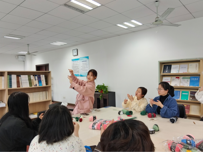 随后,进行随机分组,每组配备的小组长负责为大家进行简单的操作示范,并鼓励同学们发散思维,勇于探索,打造自己独有的作品风格和钩织技巧。在小组长耐心的指导下,同学们对钩织有了更加深刻的理解,看到精巧的玫瑰于指尖盛放,目睹娇嫩的桃花在手掌诞生,伴随着窗外摇曳的枝丫,同学们的心情愉悦而欢快。