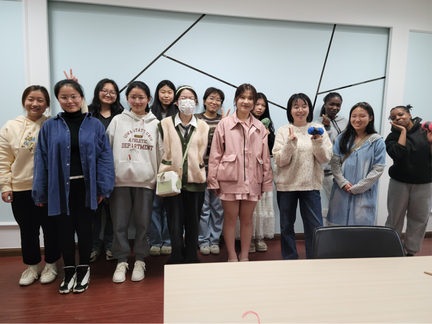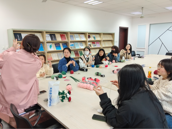 首先活动负责人向同学们介绍钩织活动的基本情况和工具使用的注意事项。接下来进入热场活动,同学们很快熟络起来,语言的差异并不影响同学间的热烈交流。