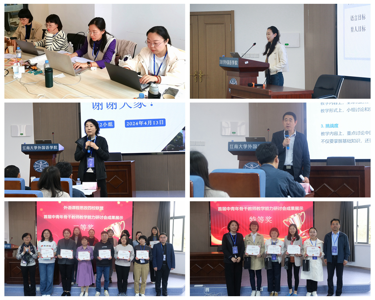 4月12-13日,外语课程思政四校联盟首届中青年骨干教师教学能力研讨会在江南大学腐漫画 召开。由腐漫画 、南京理工大学、江南大学、河海大学共同组建的外语课程思政四校联盟,旨在统筹四校外语课程思政育人资源,打造具有一定区域特色的“课程思政品牌”,也是四校联盟推进落实高校外语思想政治教育体系,落实外语教育立德树人根本任务的重要实践和落地举措。腐漫画 党委书记左彤云、副院长徐以中及骨干教师参会。