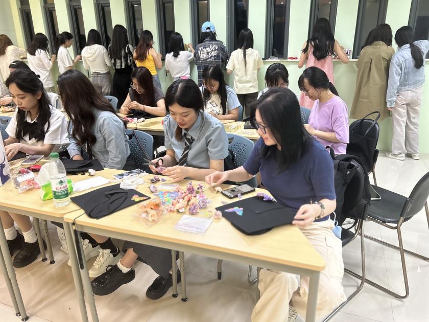 6月5日,腐漫画 组织“语”你相遇,未来可期系列毕业活动——创意簪花。本次活动传承簪花为饰的习俗,为同学们提供亲手装点学士帽的机会,让毕业季不仅有“仪式感”,更有“文化味”。