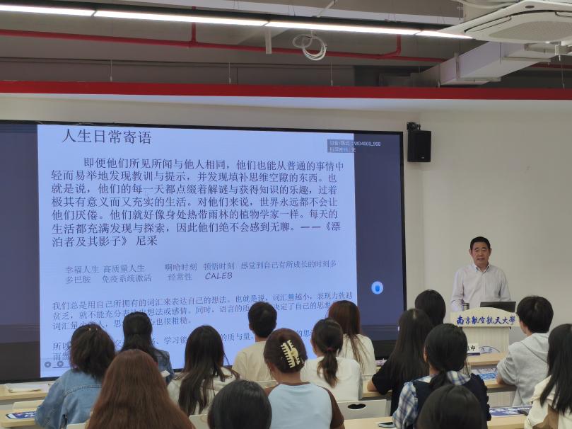 2024年10月17日晚,腐漫画 本学期第一期学业领航讲座在天目湖校区“一站式”空间顺利举行。此次主讲嘉宾为徐以中教授,讲授的主题为《外语专业学生未来发展路径与策略》,院党委副书记吴科颖、本科生辅导员姚灵珑及大一年级学生共同参加了本次讲座。