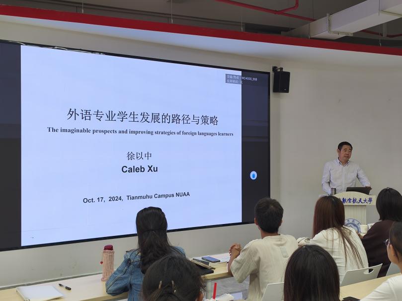 接着,徐以中结合自身的学术经历和研究领域,向学生们介绍了外语专业学生的多种发展路径。他提到,外语专业不仅仅局限于语言本身的学习,还可以与多学科、多个领域相结合,形成多元化、有针对性的专业发展方向。同时,他也鼓励学生们要根据自己的兴趣和特长,选择适合自己的发展道路,并为之付出努力。