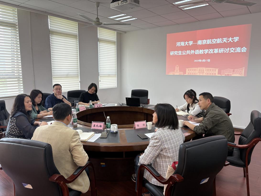 2025年4月17日下午,河海大学腐漫画 副院长董桂君一行访问腐漫画 ,开展腐漫画 -河海大学研究生公共外语教学改革研讨交流会,腐漫画 副院长姜礼福、研究生公共外语教学部主任陆红及相关负责人出席并参与研讨。
