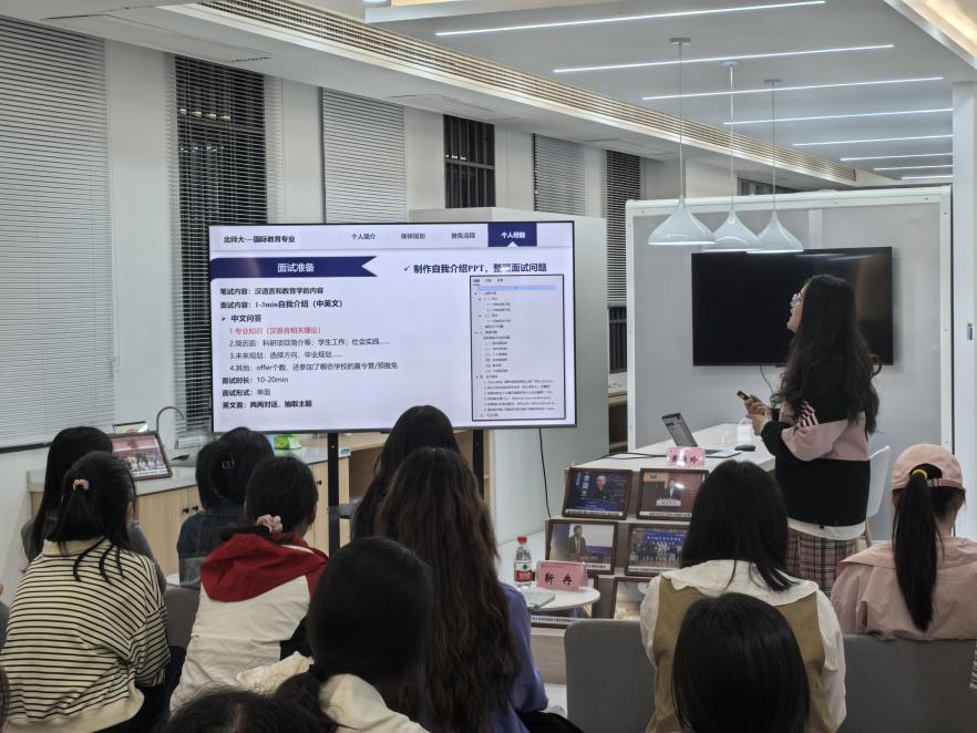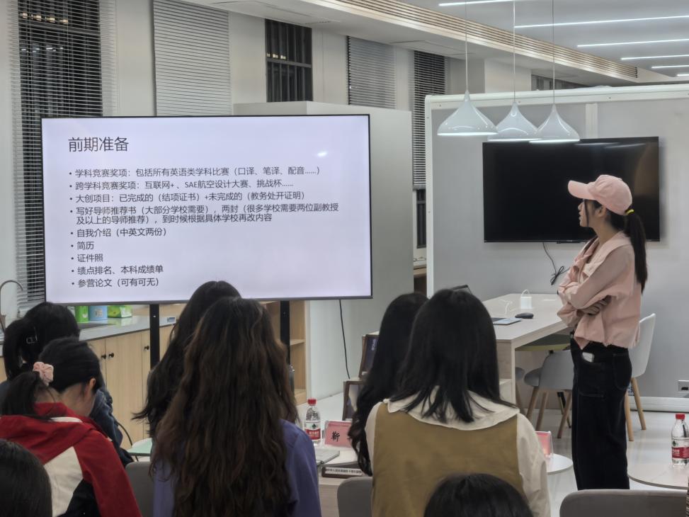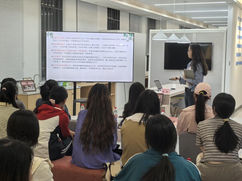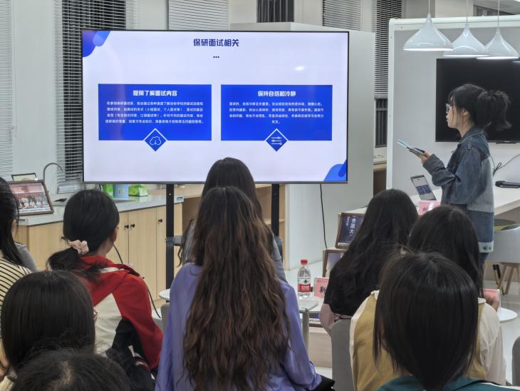 黄佳玲学姐为同学们介绍了推免流程与重要时间节点,分享了“国别区域研究”与“汉语国际教育专业”两个专业的复习经验。她还向同学们强调了文书材料准备的诸多细节,提醒同学们要精益求精。最后,她暖心鼓励大家保持十足信心,在反复经历申请、笔面试的过程中,不断磨砺自己,锤炼强大心脏。