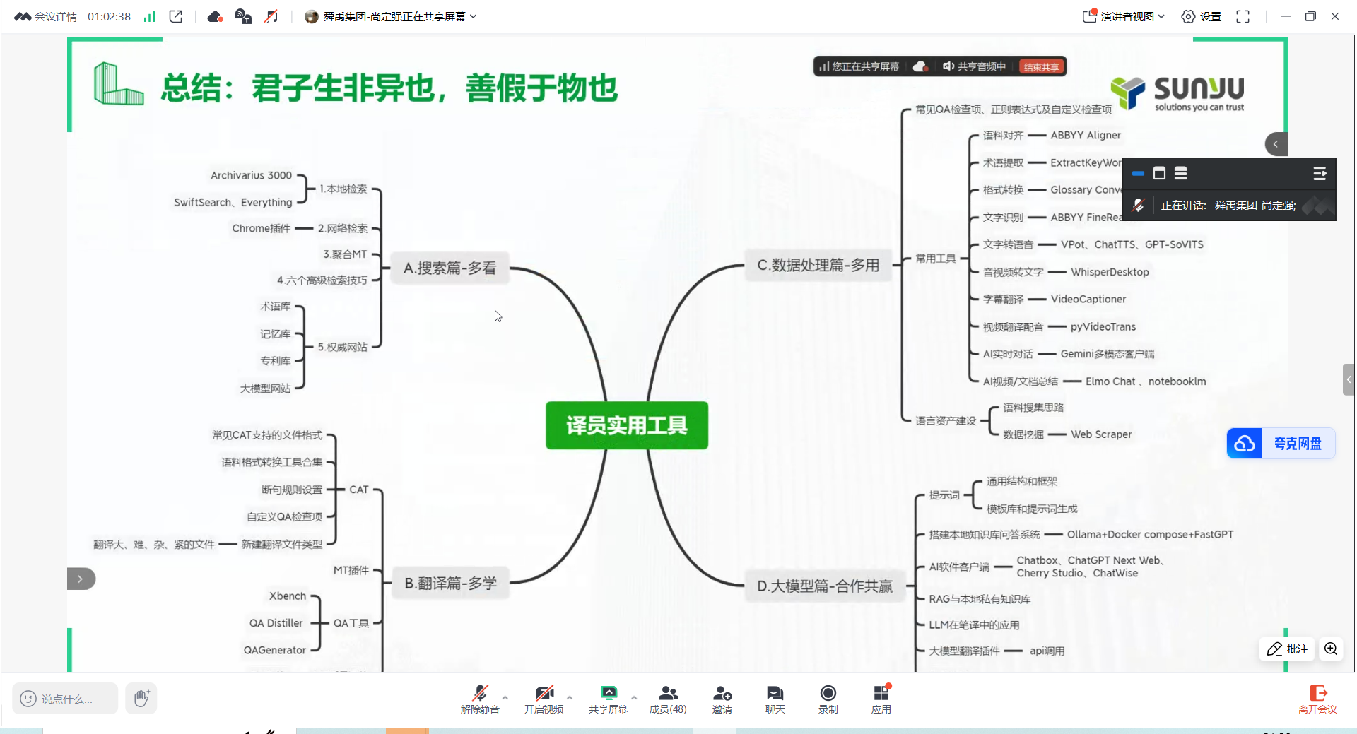 5月10日,舜禹技术部尚定强经理主讲翻译工具的运用。“工欲善其事,必先利其器”,在讲座中,尚定强认为,作为新时代的译员,翻译工具对于译者提高翻译实践能力非常重要,他梳理了翻译市场上常用的工具,通过具体的案例展示工具的操作和使用。另外,他还强调了大语言模型对于提高翻译效率与质量的重要性。