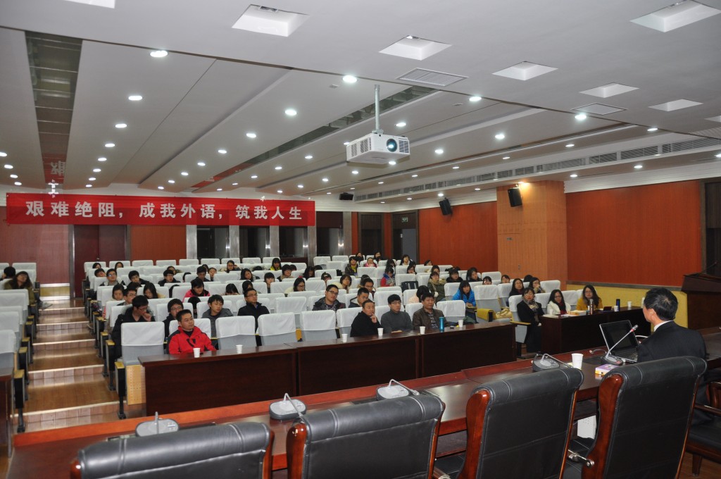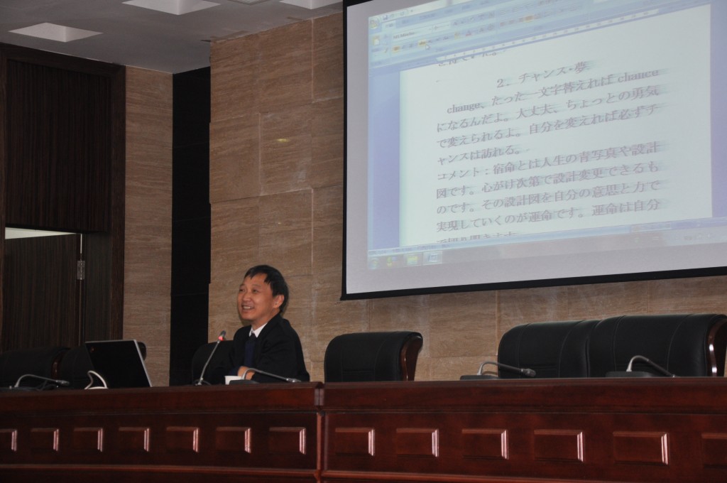 11月29日下午,在外国语学院国际会议中心,国内日语领域领军人物、贵州财经大学、淮海工学院两所高校外国语学院院长,中国日语教学研究会理事,江苏省日语研究会副会长赵平博士带来了一场以“艰难阻绝,成我外语,筑我人生”为题的精彩讲座。来自外国语学院日语系的学生和众多对外语学习抱有浓厚兴趣的非专业学生济济一堂,讲座高潮迭起,掌声雷动。