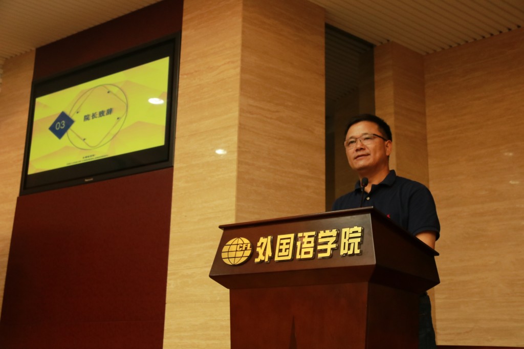 2017年9月5日下午,外国语学院2017级新生开学典礼暨专业介绍会于外国语学院国际会议中心举行,学院党委书记刘健荣、院长范祥涛、副院长刘长江、副院长徐以中、专业教师、研究生导师代表、辅导员和2017级本科生、研究生200多人参加了典礼,典礼由院党委副书记梁薇主持。