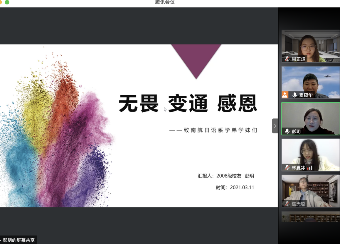 《科技文化创新创想》是外国语学院日语系设置的精品企业课程,由日语系邀请成功企业人士讲授。2021年第一讲于3月11日以《日语学子职业发展规划——以日资企业为例》为主题,通过腾讯会议模式开启。主讲人为08级校友彭玥,现任永旺(湖北)商业有限公司人事主管。