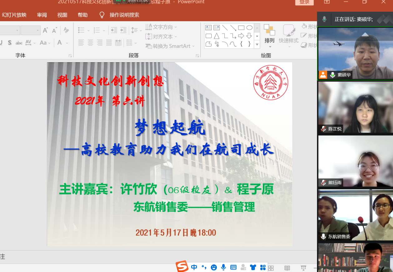 5月17日晚18点,外国语学院日语系《科技文化创新创想》第六讲通过腾讯会议开启,主题为《梦想起航——高校教育助力我们在航司成长》,主讲人为东航销售委的许竹欣和程子原两位优秀代表,其中许竹欣为南航06级校友。