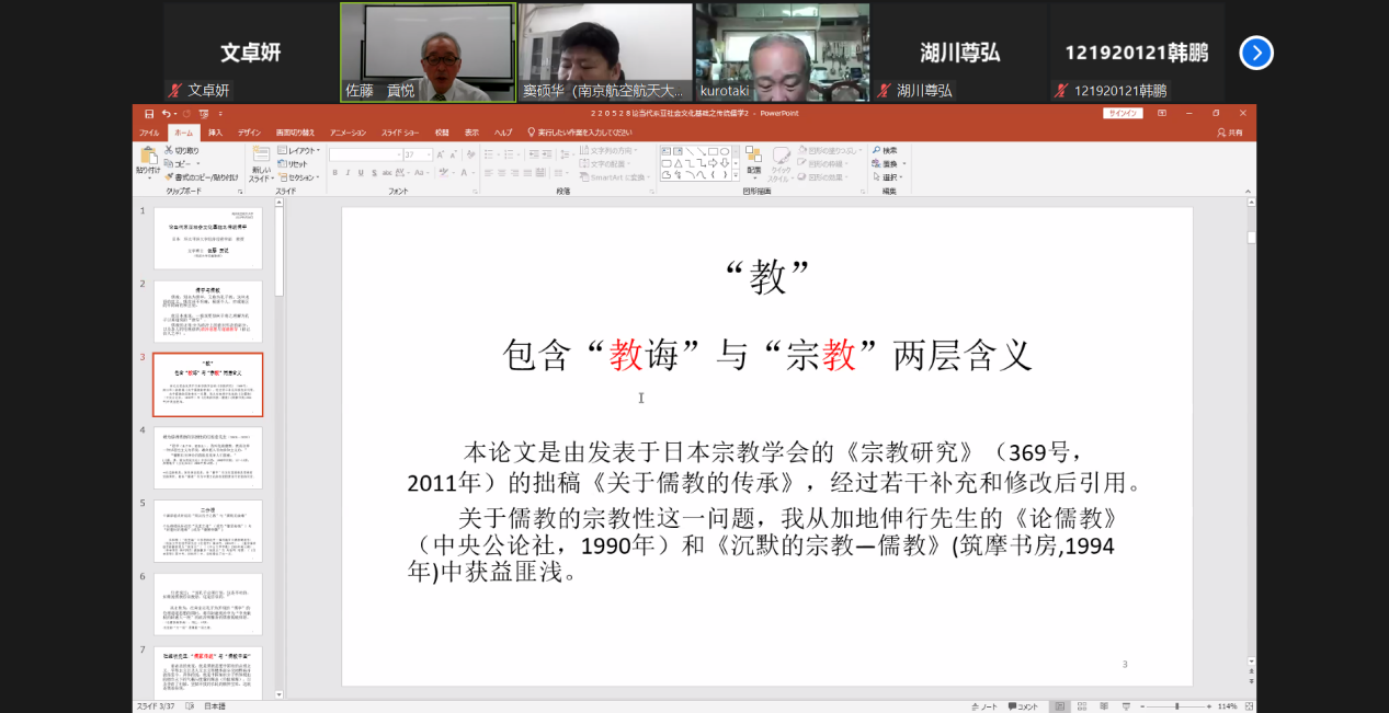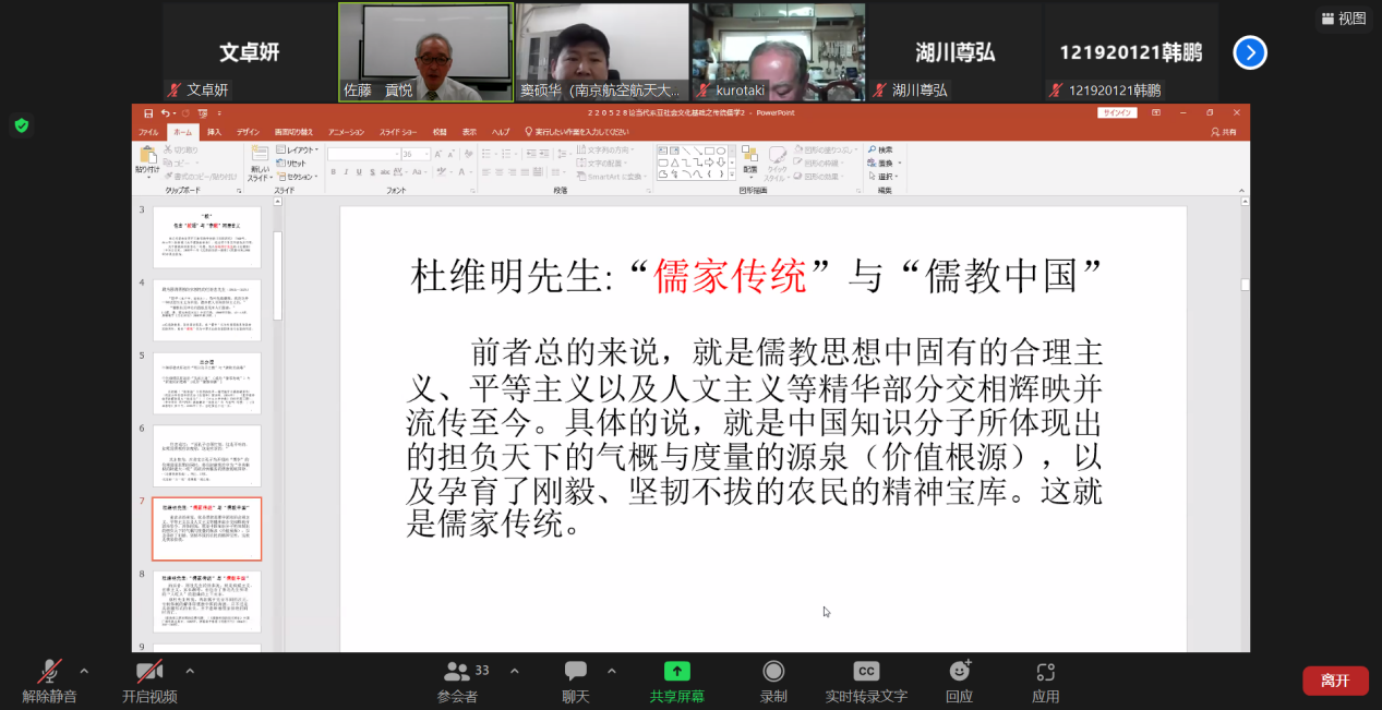 5月28日(周六)上午9:00,外国语学院日语系海外名师讲坛第一讲通过线上ZOOM会议成功进行,主题为《現代東アジア社会の文化的基礎としての伝統儒学》。主讲嘉宾为环太平洋大学教授・筑波大学名誉教授佐藤贡悦。讲座由日语系主任窦硕华老师主持,外专项目领衔人・东京农业大学黒瀧秀久教授和南航日语系40余名同学参加了讲座。